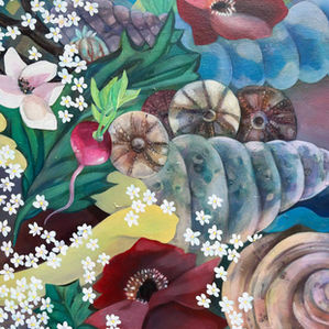 “ShellBodies carry eight years of meditative nature studies that I leaned on to process the transition between life to death. My entry into the work of nursing brought me face to face with how bodies move from this life into the unknown. What was once vibrant and interactive is replaced with a mysterious stillness. My job gives me the responsibility of holding and caring for the bodies of those who go on ahead of us. It is a traumatic privilege. Painting the delicacy of nature has become a place of meditation on the lives I so often spend last moments with. Their unique stories are so much like the intricacies of a leaf, a petal, a washed stone. When the body transitions into death, what is left behind is a shell marbled and grooved with the history of their life.